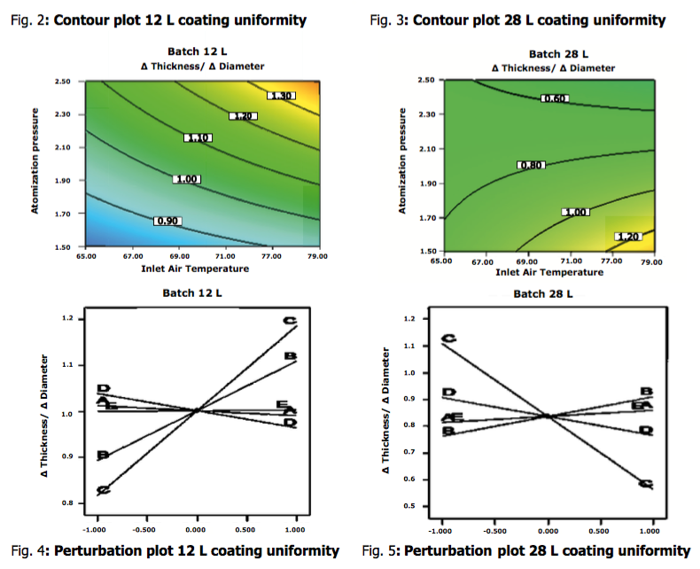 The study showed that Process Efficiency was positively influenced by Air Flow Rate and negatively by Atomization Pressure in the 12 L batch while in the 28 L bath Process Efficiency improved when using lower values of Air Flow Rate and Inlet Air Temperature combined with high spraying rates. In addition the several significant interactions, provided the tools for further understanding the complex phenomena governing the coating process, especially at the marginal manufacturing setting expressed by the small batch size compared to the drum’s capacity.