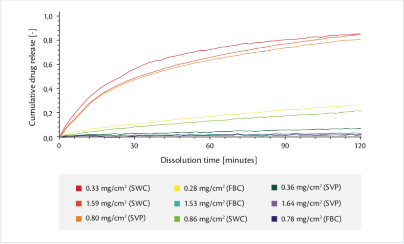For dissolution testing, a standard USP Dissolution Apparatus 2 (Paddle) from ERWEKA, equipped with continuous on-line UV measuring (Agilent 8453), was used. Since taste-masking functionality is to be delivered in the oral cavity, phosphate buffer (pH 6.8) was used as dissolution media (700 ml±1%, 37°C±0.5 K, n=13).