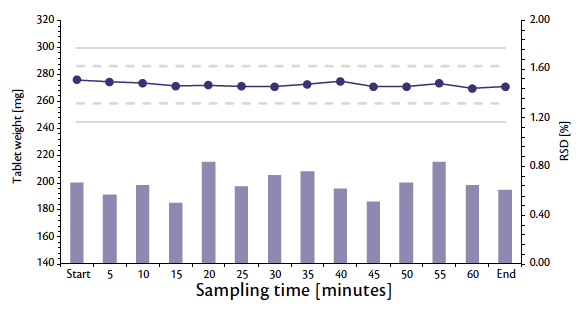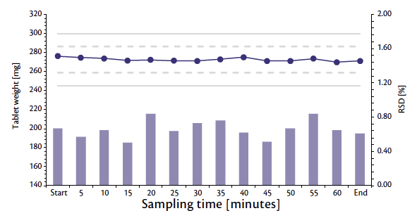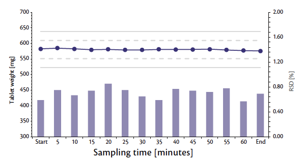 Figure 2: Weight trend and RSD during 1 hour of production at full nominal tablet press speed.