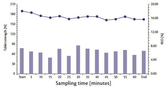 Figure 3: Tablet strength trend and RSD during 1 hour of production at full nominal tablet press speed.