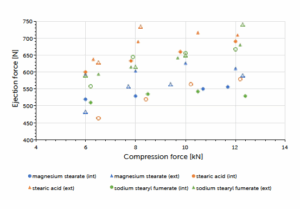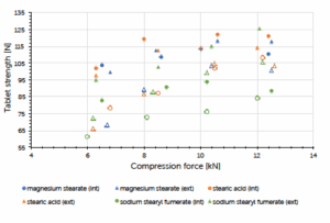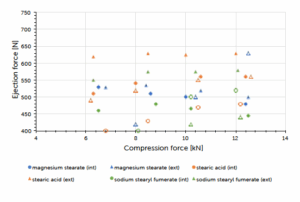 The theoretical contents for the formulations carrying internal lubrication were confirmed. A magnesium stearate content of 0.05 to 0.15% could be detected for tablets where external lubrication was applied. The content of sodium stearyl fumarate was below the detection limit and couldn’t be determined. The ejection force measured during tableting, is the indicator for describing the efficiency of lubrication. Generally, it could be observed that external lubrication led to slightly higher but acceptable ejection forces compared to internal lubrication. However, the major driver was the type of lubricant used and not the way how it got introduced to the process. Independent of the lubrication approach, an increase in compression force had hardly any impact on the resulting ejection force value. This result and conclusion were applicable for both scales (Graph 1, Graph 2). Tablet strength that represents a quality measure, is generally affected by the lubrication approach. External lubrication fostered higher tablet strength, at least at higher compression forces.