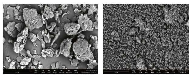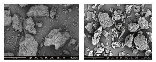 Figure 5: SEM images of Left: magnesium stearate (Ligamed MF-2-V) and right: FD&C blue #2, both at 5000x magnification.