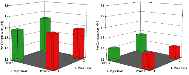 Figure 7: Pre-Compression Force (PCF) [kN] as a function of weir type and magnesium stearate (MgSt) inlet port at 1% MgSt (left) and 3% MgSt (right) with SuperTab® 22AN.