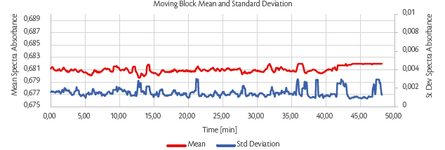 Process stability was monitored online by NIR spectroscopy using moving block analysis. The online moving block was calculated every time a new spectrum was recorded, and the moving block standard deviation (MBSD) and moving block mean (MBM) were evaluated to obtain the behaviour along the entire process to understand immediately if the process was kept inside the design space and if some deviation occurred.