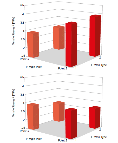Figure 8: tablet tensile strength (TS) [MPa] as a function of weir type and magnesium stearate (MgSt) inlet port at 1% MgSt (left) and 3% MgSt (right) using SuperTab®22AN as a filler.