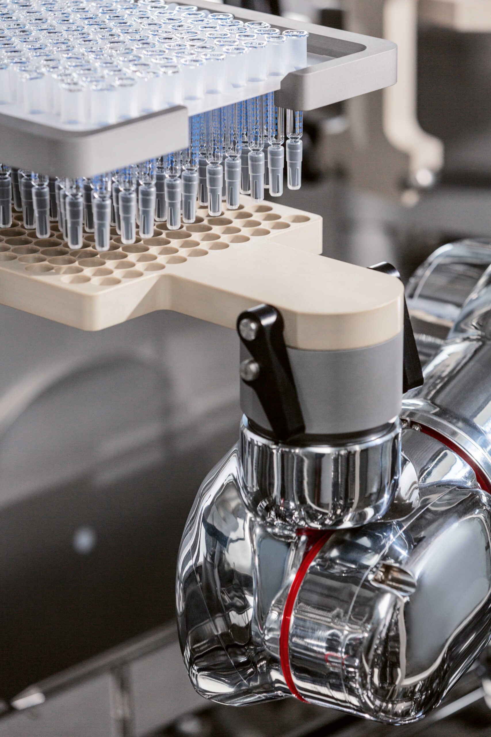 Flexibility and straightforwardness in control and programming are not a secondary aspect, since it is necessary to create parameterized trajectories such as to achieve the objectives of cycle time, accuracy and repeatability. It is important for the robot to become interfaced with different types of interchangeable tools, grippers and suction cups. To avoid exposed pipes and cables in the aseptic area, a solution was identified that provides for routing them inside the body of the robot. The use of advanced robotic manipulation during all production operations, from the opening of the external/internal bag all the way to the capping station, allows a very smooth production process to be obtained, dramatically reducing the risk of cross-contamination.