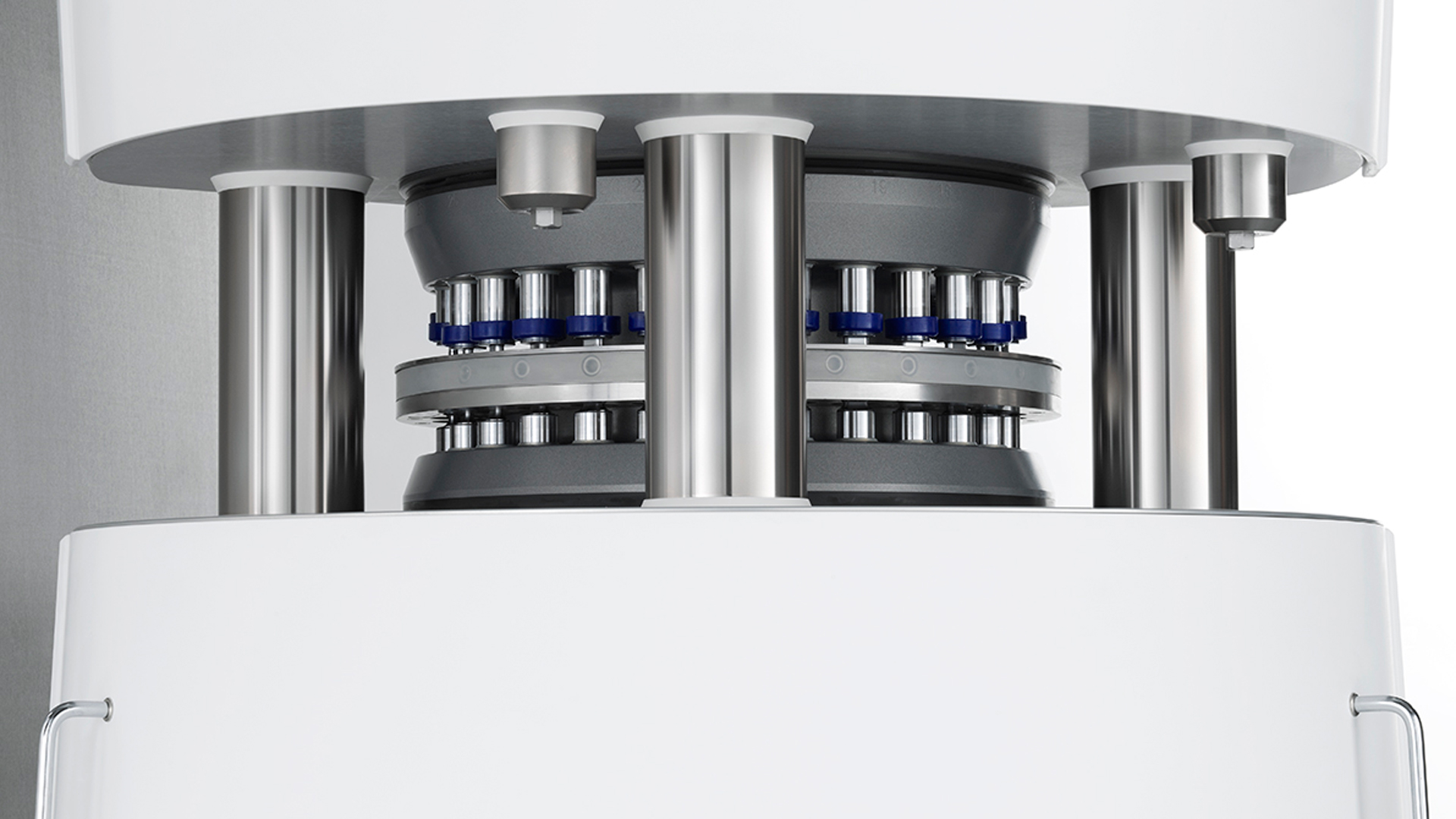 Tableting was performed in rotary tablet press (Prexima 300, IMA) equipped with Euro-D turret hosting 27 stations Eu-D 441 25 mm biconvex round tablets. Feeder was standard with flat paddles installed: the die loading of the blends under analysis was achieved with the standard IMA Prexima tablet press set-up.