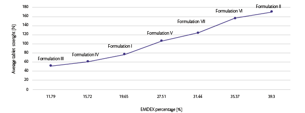To confirm the choice in terms of filler concentration, tablet strength was analyzed compared to EMDEX percentage for each formulation mentioned (Figure 3).