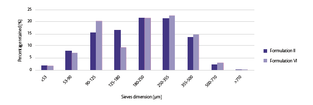 Technological features measured for Formulation II were 6% and 2.45% as Carr Index and L.O.D. whereas for Formulation VI respectively 7% and 2.84%. Particle size distribution (Figure 2) reflects the different percentage of excipients used
