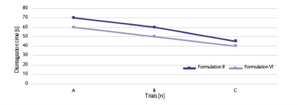 All the data are comparable except the test C where the final maximum output was different for the two formulations (80 rpm respectively for Formulation II and 70 rpm for Formulation VI). Disintegration time has been monitored as well for the three tested performed (A, B, C) (Figure 5).
