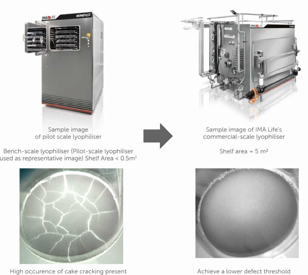Customer worked with the production of an exotoxin drug formulation and aimed to continue production using a commercial scale IMA lyophiliser, Lyomax 5 (5 m2), with a cycle developed in a bench-top lyophiliser (<0.5 m2). The customer cycle, however, produced lyophilised cakes with a cracking defect and was not ready for use in a commercial lyophiliser without further testing.