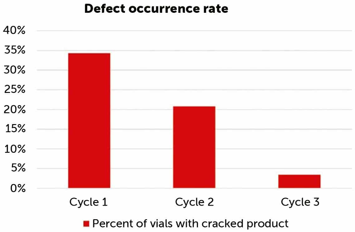 Three cycles were performed to achieve a reduction in occurence of cake cracking. Cycle 1 used process parameters identical to the customer’s lab-scale operations but in IMA’s pilot-scale lyophiliser. Cycles 2 and 3 modified the process parameters used in Cycle 1 via annealing to decrease the defect occurrence rate. Defect occurrence rate was reduced from 34.3% to 3.4%.