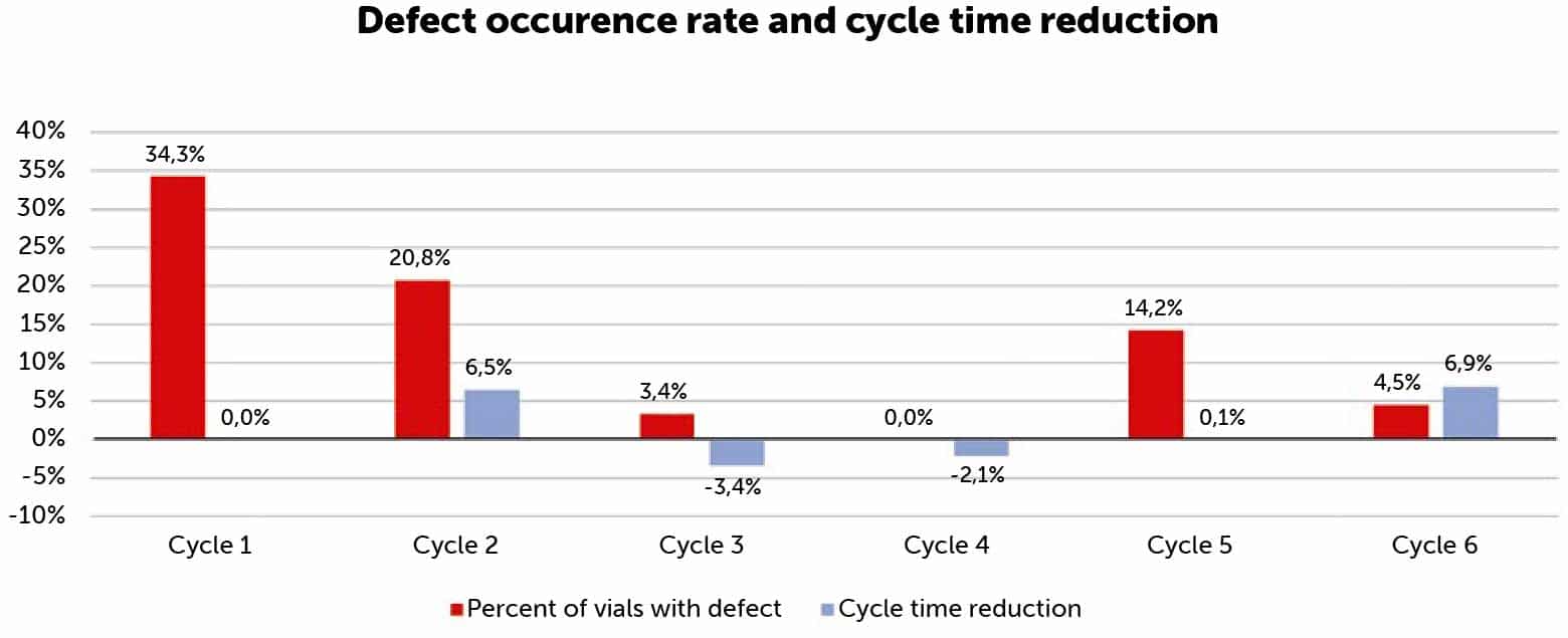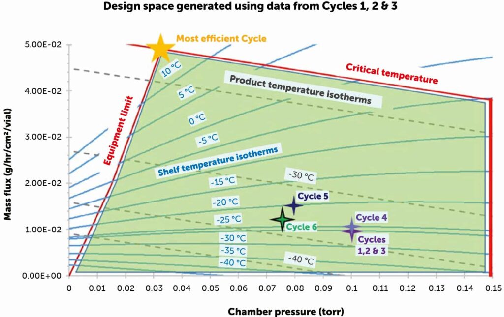 As a consequence of a decreased defect occurrence rate, overall cycle time in Cycle 3 was increased by 3.4%. An exotoxin-specific design space was created to characterize the product behaviour as changes to the process parameters were made for future cycles. Three additional cycles were performed to achieve a reduced overall cycle time. Cycles 4, 5 and 6 modified the drying parameters executed in Cycle 3 and was able to reduce cycle time by 6.9%.