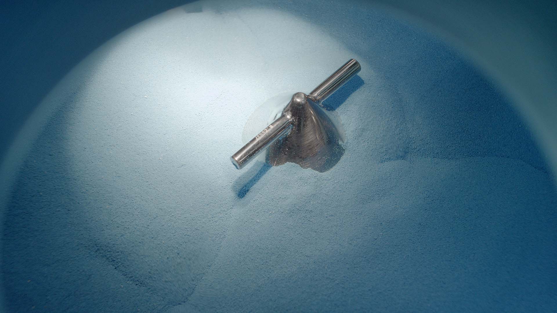 A smooth proven granulation procedure for manufacturing for MTE granules has been developed by FMC with IMA Active Laboratory support. MTE raw powder is loaded in containment with no dust generation in the room by means of vacuum into the Roto Cube bowl. Pure water is rapidly sprayed by means of a peristaltic pump on to the powder while mixing. MTE is poor soluble in water but once wet self-binding properties. In combination with the Roto Cube’s impeller high-shear to the mass particles becomes plastic enough to generate sphere-like agglomerates.