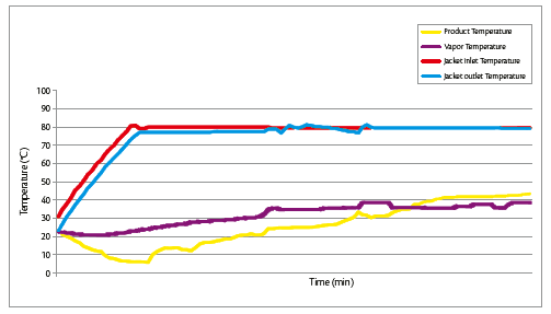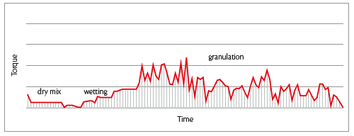 Once the granules are obtained, drying phase can begin. The jacketed process bowl is heated and put under vacuum to promote water evaporation. Impeller speed is then reduced at minimum to gently move the granules so to promote heat transfer between the heated process bowl and the bulk mass (Figure 2).