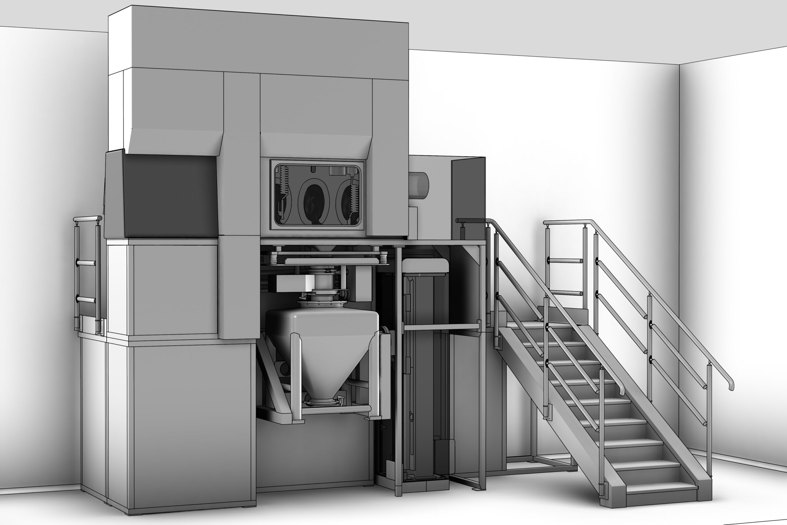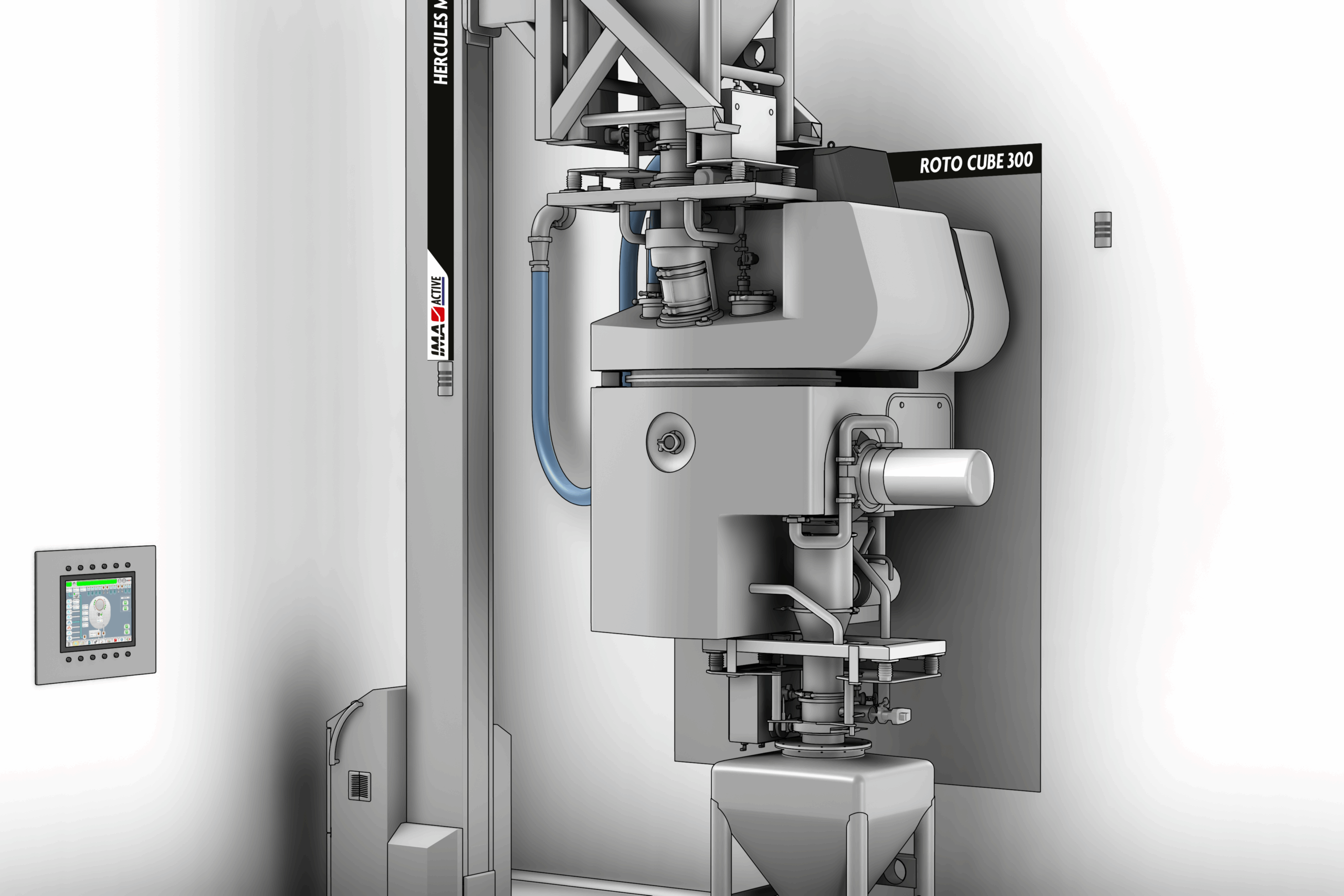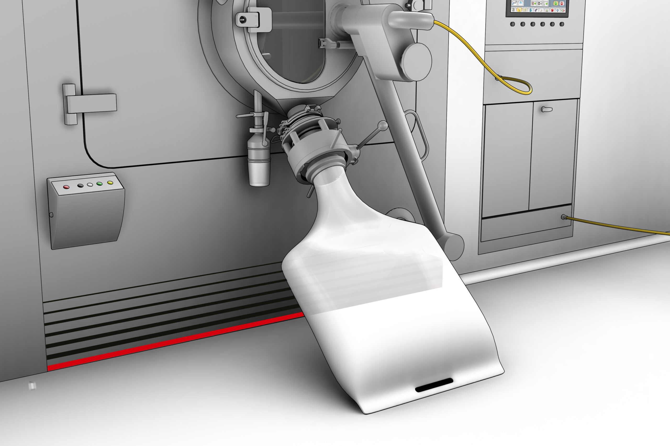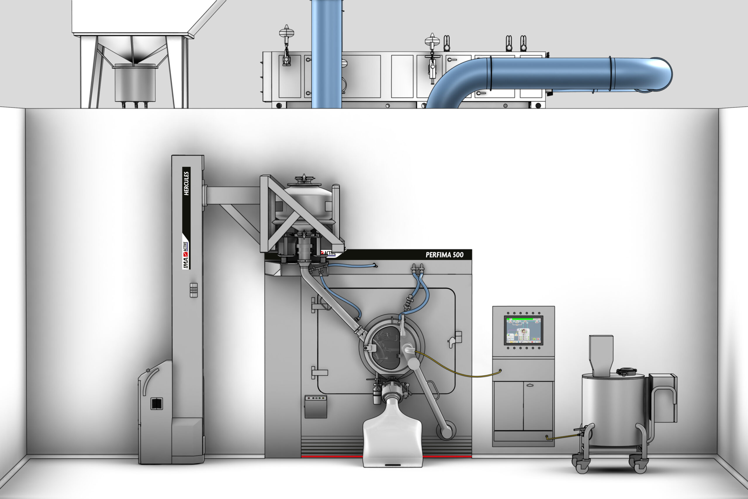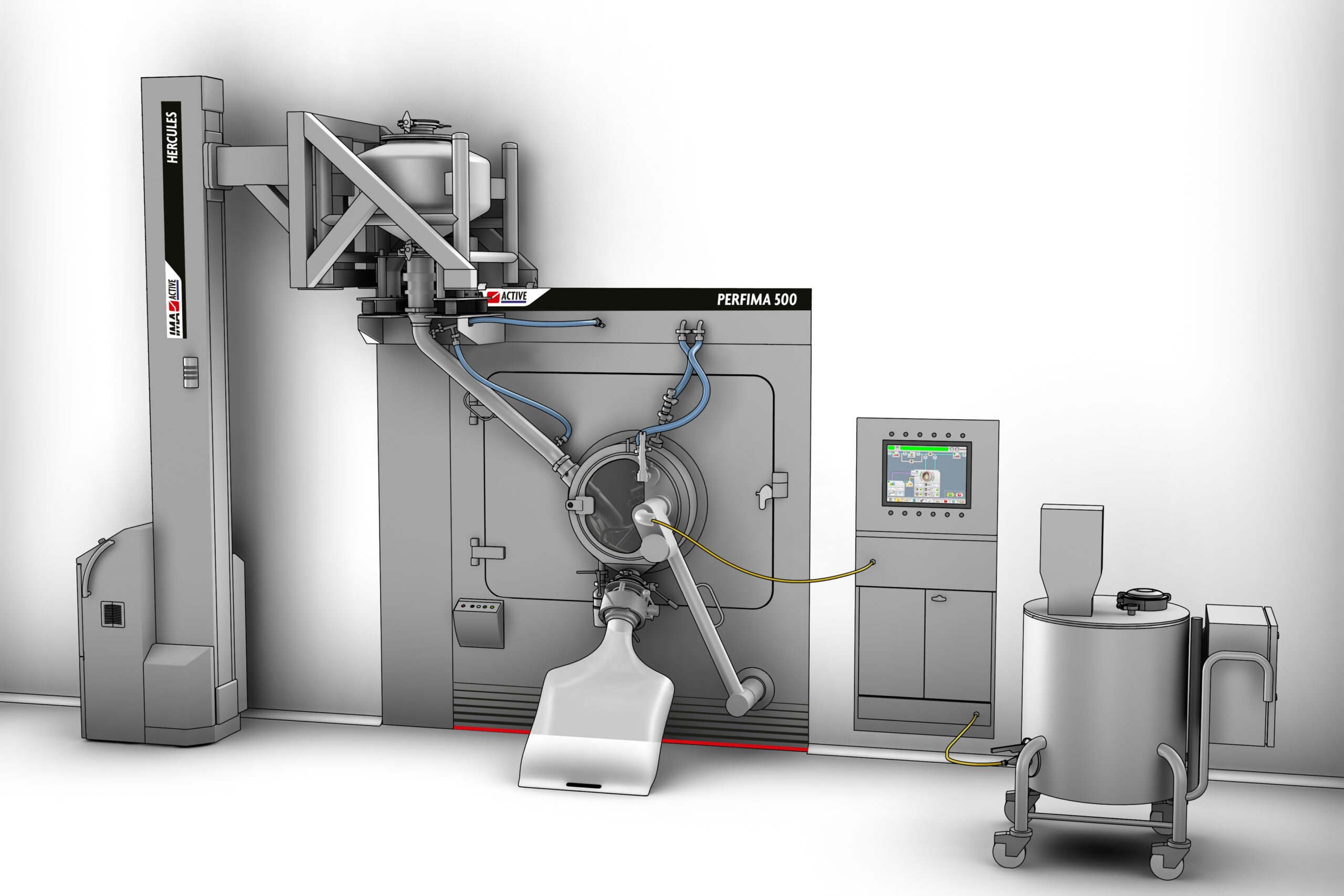 The machine can be fitted with automatic systems for product loading. The IBC containing the cores is elevated by HERCULES lifting column and fitted with TWINVALVE for contained transfer into the pan. The product is then loaded by gravity. Isolation at product exit is achieved through a single use bag for containment.