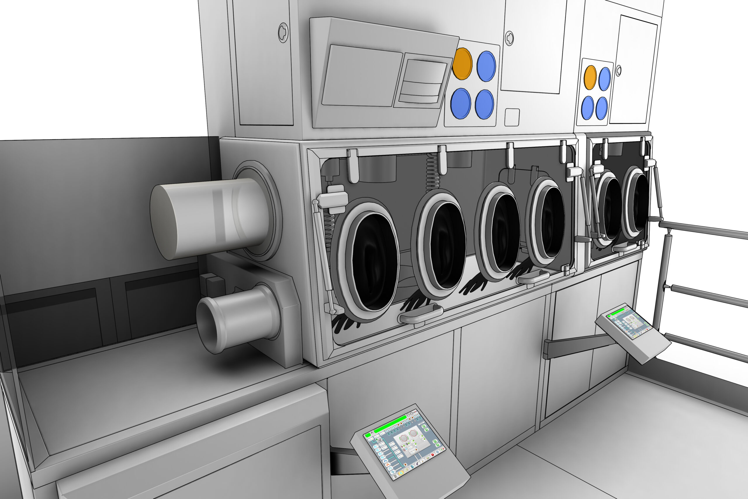 Accessibility into the isolated area can be achieved by means of glove ports and RTPs (Rapid Transport Ports): they allow the operator to work in the protected area without contamination. Quantity of glove ports and RTPs can be evaluated upon operation requirements.