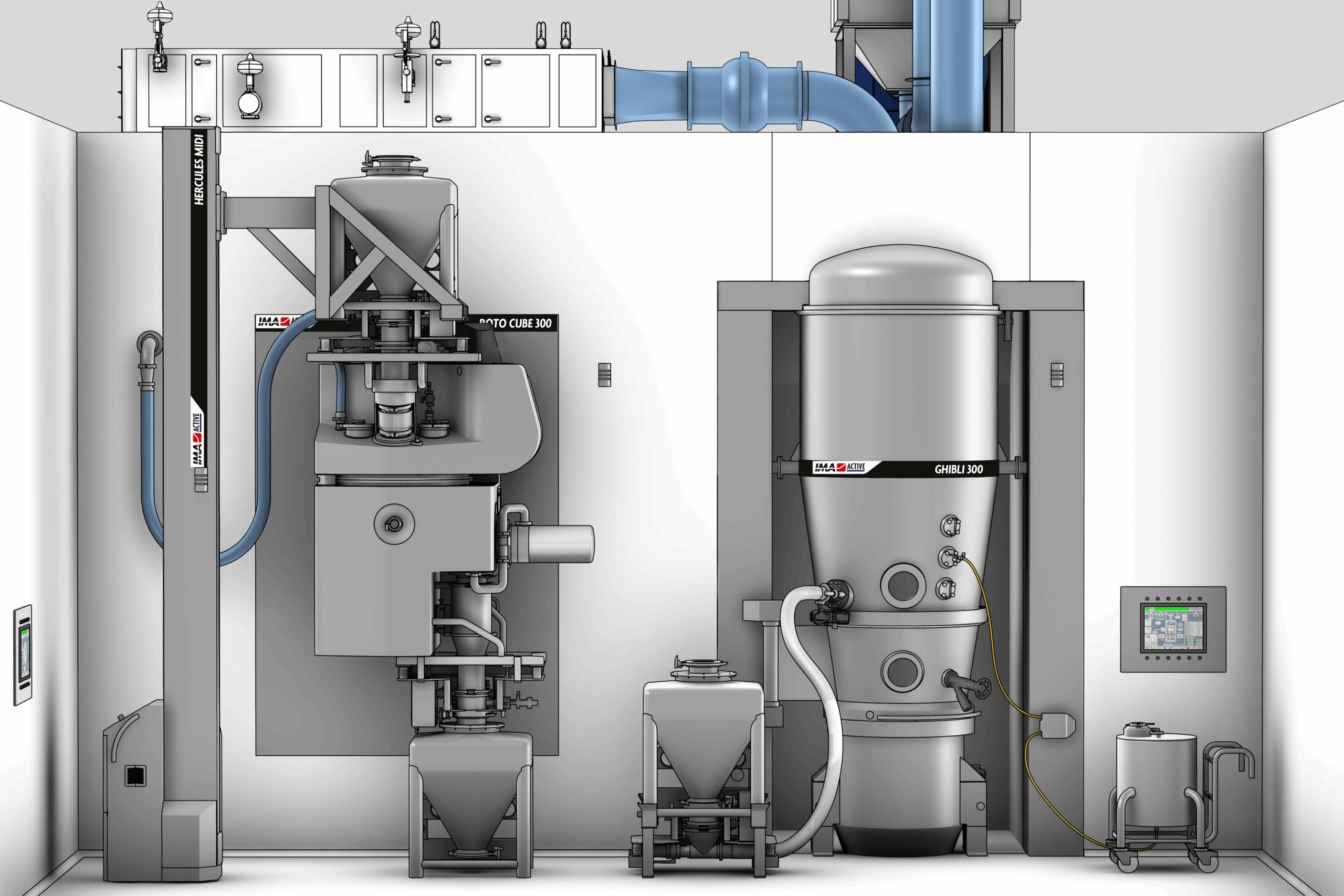 As an alternative configuration, ROTO CUBE and GHIBLI can work in line: wet granules can be quickly transferred in automatic mode from ROTO CUBE for drying into GHIBLI fluid bed.