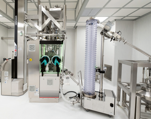 Last but not least, we should highlight how the products are handled inside the laboratory. Since we often work with active products, it is essential to safeguard workers’ safety so that they never come into contact with the powders or products being handled. All the materials are handled and moved inside bins supplied by IMA, which are fitted with split valves that prevent product escaping. These bins are then lifted by Hercules columns (IMA, Italy) for loading the tablet press and capsule filling machine by gravity, once again preventing product leakage.
