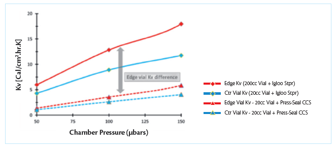 Product temperature in vials with press-seal CCS was up to 3.5 °C higher than product temperature in vials with conventional stoppers. Kv of 20 cc vials with igloo stoppers is higher by a factor of 2.9 – 4.2 times than Kv of 20 cc vials with press-seal CCS suggesting that a significant difference in heat and mass transfer gets introduced when stoppers are switched even for the same vial type.