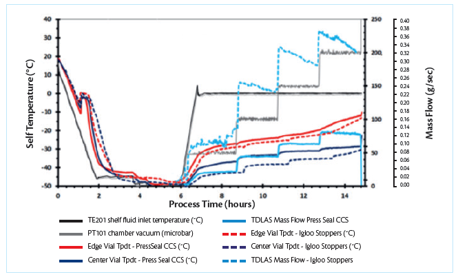 Figure 3. Superimposed process plot showing difference between product temperature profile and mass flow trend between vials containing press-seal CCS and vials containing conventional igloo stopper.