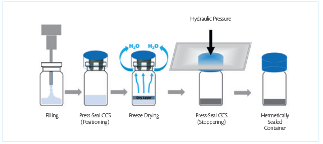 Emergence of newer press-seal container closure systems (CCS) with pre-assembled rubber stopper and plastic cap is a significant effort towards optimization of parenteral drug manufacturing operation. In such CCS, capping is achieved by the application of simple vertical pressure during the stoppering step inside a freeze dryer. Elimination of the crimping operation via these CCS generates cost saving in an aseptic fill to finish operation by allowing the process to be fully contained inside closed systems like isolators and restricted access barrier systems (RABS).