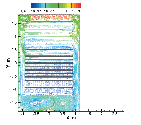 Coupled fluid thermal models were used to compute the thermal gradients for a 56 m2 shelf area freeze dryer. It was found that in the region covered by the vial pack, the largest gradient could be as large as 2 °C as shown in figure 1. This thermal gradient provides the first challenge associated with the kryo fog method on production scale freeze dryers.