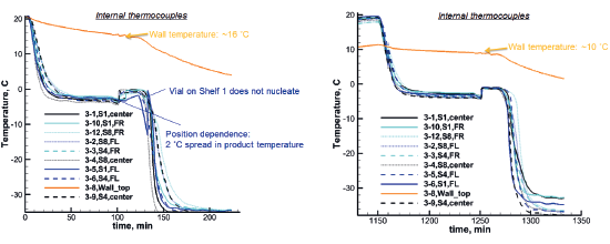Clusters of 10 cc Schott tubing vials (Lebanon, PA) with 3mL of a 3% w/w mannitol solution with one internal and one external thermocouple (thermocouples taped to the side of the vial) were placed throughout the top, middle, and bottom shelves within the freeze dryer. Internal thermocouples were used to monitor the product temperature, while external thermocouples were used to monitor product nucleation without providing a nucleation site. The wall temperature was also monitored with a thermocouple to monitor the effects of radiation from the walls.