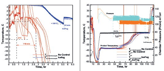 Figure 4 provides the cycle data during the kryo fog injection phase. By using artificially induced nucleation, the primary drying duration (as indicated by the time the last thermocouple reaches the shelf temperature) is reduced by 19%. While the overall cycle time did increase from 1514 minutes to 1854 minutes (since the original cycle cold loaded the product on -40 °C shelves), it is critical to note that the cycle can be optimized (for example, by increasing shelf temperature since the product resistance is expected to have reduced), which may reduce overall cycle time. The overall product uniformity was improved by 40%, further concluding the increased batch homogeneity associated with induced nucleation.