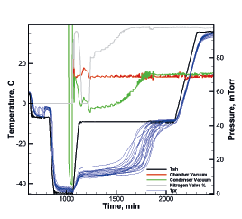 During the loading and freezing ramps, the jacket of the freeze dryer was cooled with the silicone oil used to maintain the temperature of the shelves. After loading, the shelf temperature was held at -7 °C for about 90 minutes at which point, the chamber was evacuated to a reduced pressure, and kryo fog introduced.