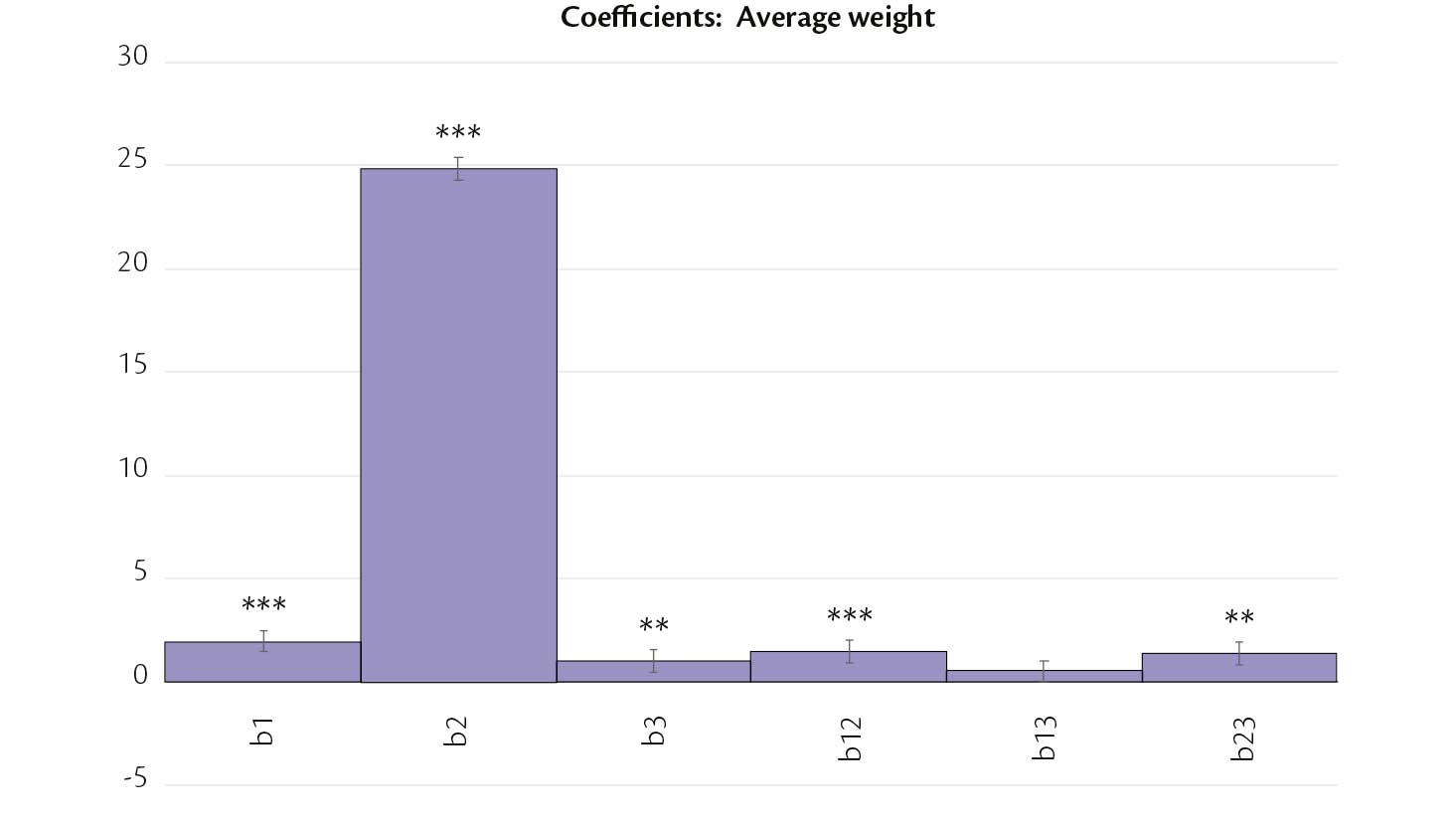 Average weight= 41.48 + 1.94 X1 + 24.79 X2 + 0.99 X3 + 1.45 X1X2 + 0.48 X1X3 + 1.32 X1X3 (1) Coefficients associated to linear terms were highly statistically significant, confirming, as could be expected, that all factors have a critical role on the final weight (Figure 1).