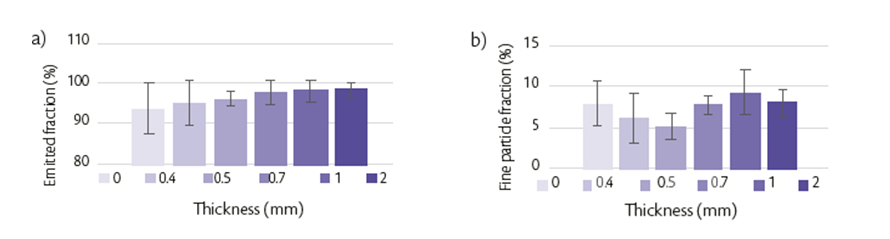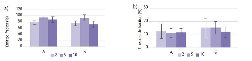 Taking into consideration the emitted fraction, no significant differences could be detected between filling setting A and B for mixtures containing 2% or 5% of fine fraction, while a significantly lower amount of powder was emitted for the mixture with 10% fines filled with method B (p= 0.001) (Figure 4a).