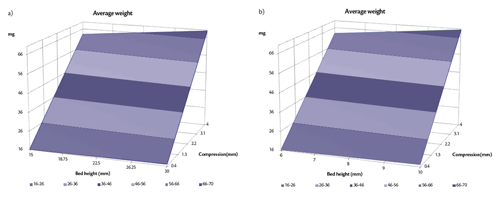 As it can be deduced also by coefficient digits, compression is by far the most relevant factor affecting final weight, as also confirmed by significance of interaction terms involving this parameter. This is also evidenced by response surfaces related to interaction between compression and bed powder height (Figure 2a) or between compression and dosage (Figure 2b).