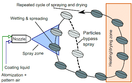 The coating process should occur in a short period of time with high coating efficiency, but also with good coating quality and minimal tablet attrition. Coating is the repeated exposure of tablets to a spray containing solute and solvent. As a tablet moves through the spray zone, it receives a partial coating with a local distribution and amount depending on the conditions on the tablet’s journey through the spray zone. After being wetted, the tablet moves into a region where drying takes place and the partial coating received is solidified on the tablet surface.