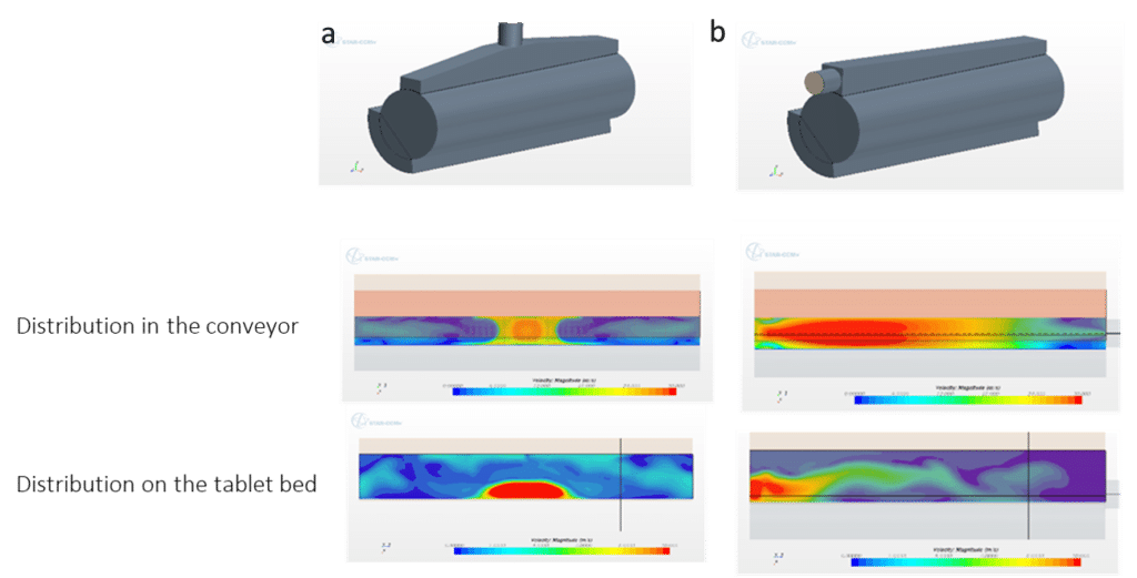 STAR CCM+ is employed to study the uniformity of the air flow distribution in two different conveyors. Version 1 has a diffuser with holes at different diameters to convey air, whereas version 2 has a linear diffuser with openings of different widths. For both versions flow distribution on the grid and on the tablet bed together with the velocity field have been evaluated by the model. Flow distribution has been evaluated by calculating a uniformity index.