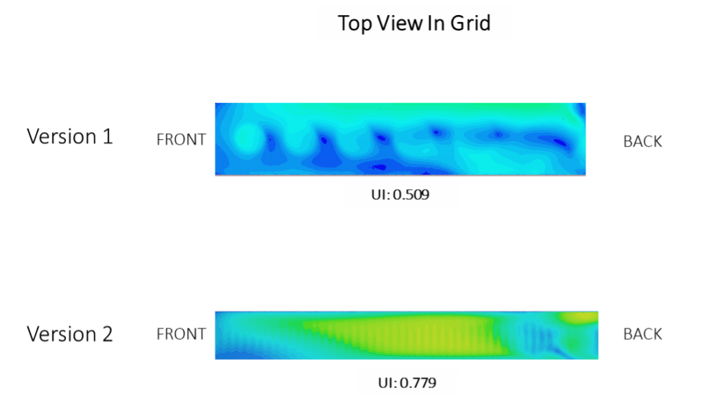 The uniformity index of version 2 is higher, which means that the pressure drops of this type of diffuser spread the air more uniformly than the first one.