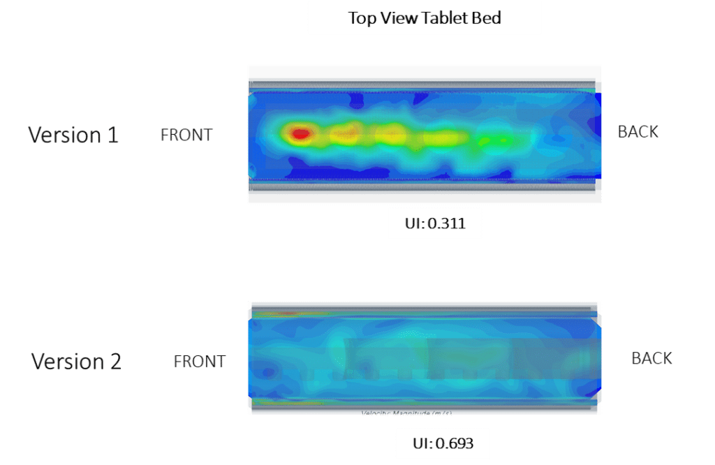 Figure 5 shows that with version 2 there is a better distribution of the airflow on the tablet bed. Moreover, the velocities of the airflow are lower than version 1, where an area of very high air velocity is visible near the front of the machine.