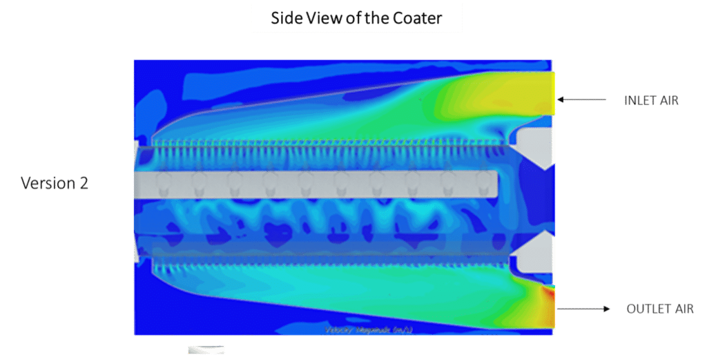 Previous studies on conveyors with two different air inlets (central and lateral) have shown that the central inlet of the conveyor does not give a uniform flow distribution since there is not enough space to let the air spread uniformly inside it. To reach uniformity, the distance of the inlet port from the drum had to be too great and the overall dimension of the coater had to increase. In order to have a compact and easy-to-use machine, it was decided to have a lateral inlet of the process air.