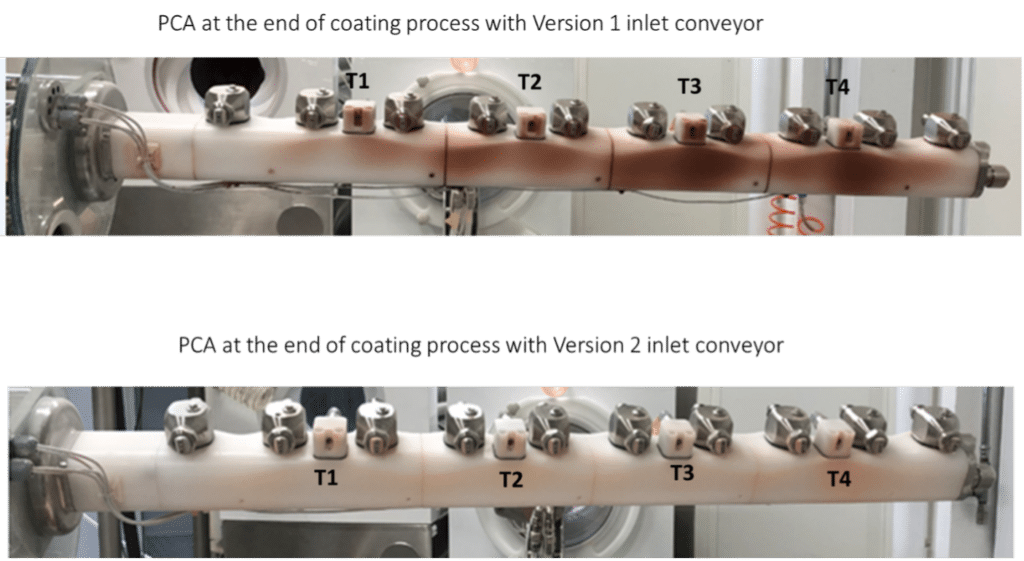 Figure 7: coating arm at the end of a 2-hour continuous coating process both for inlet air conveyor version 1 and inlet air conveyor version 2.