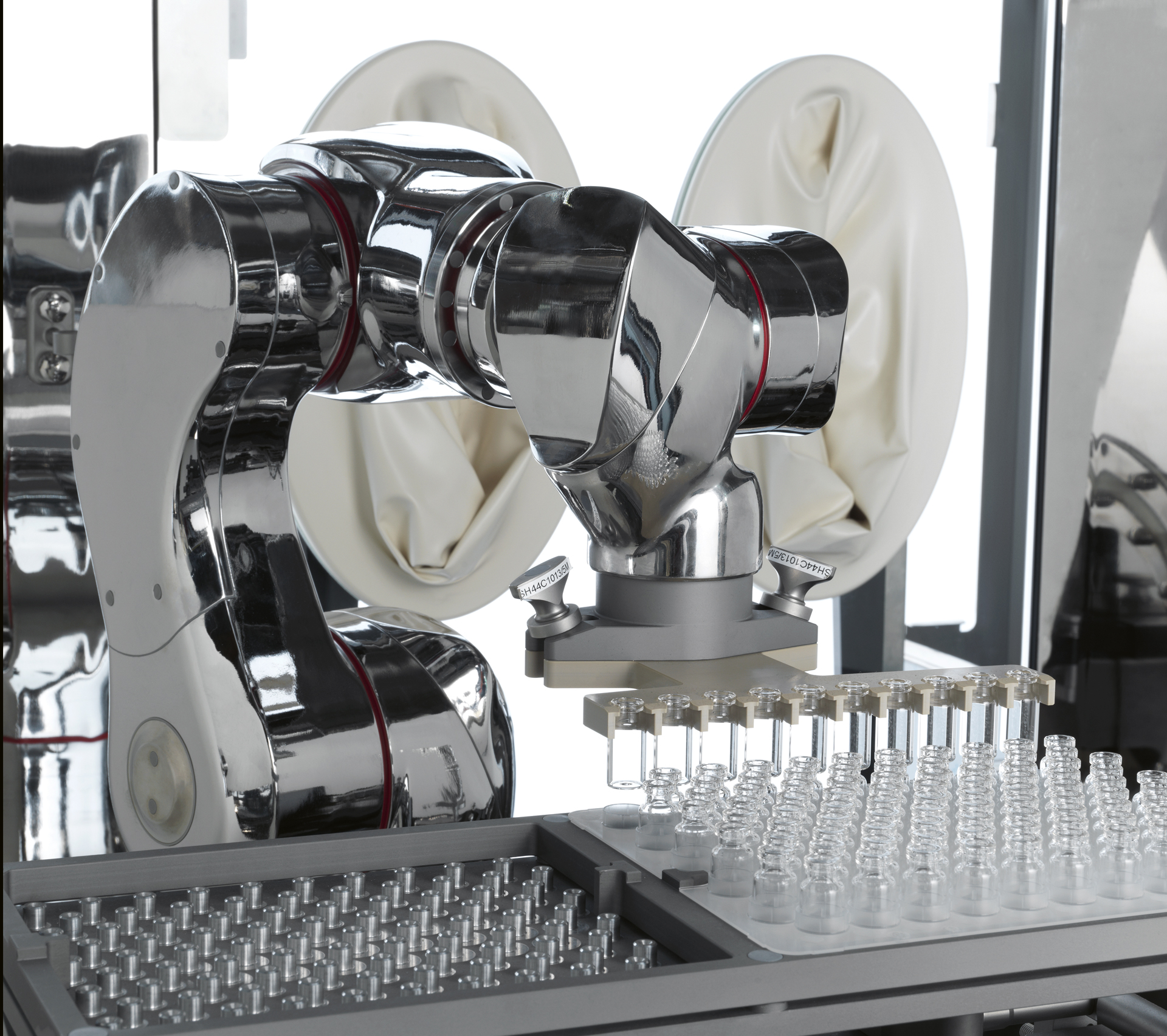 Gloves must be positioned in order to allow the operator to perform all operations inside the machine, such as cleaning, loading of caps/stoppers, removal of vials, etc. Thereby, these operations can be done by operators without opening the protection walls.