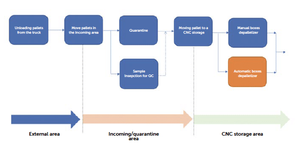 Figure 2: workflow steps from delivery to de-palletizing.