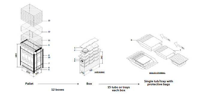 Optimisation note: It is possible to request suppliers that some RTU packaging as tub or tray be provided separately in dedicated boxes collected randomly or according to the customer’s request. This allows for inspection tests without compromising the pallet, thereby simplifying logistics management before formal approval. Containers for sample testing are agreed upon between the customer and the RTU supplier based on the customer’s incoming control strategy.