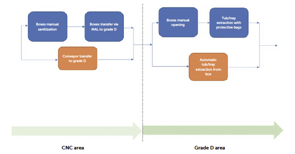 - Minimised risk in grade transition: introducing protected tubs/trays in grade C reduces the potential for particles or contaminants to manage containers as they move into higher-grade areas. Introducing RTU packaging from grade D (case 2) could bring these advantages:
