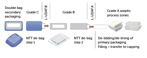 - Transfer to the aseptic fill core: the tub or tray is finally transferred into the grade A filling environment, ready for processing. The use of NTT ensures that each container remains isolated from human/machine touch throughout the transfer process, upholding sterility and reducing particle contamination risk. Only in an aseptic environment can the tub and tray be opened by removing the top lid (peeling) and the primary container exposed to open air.