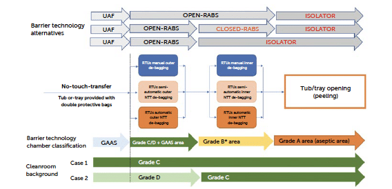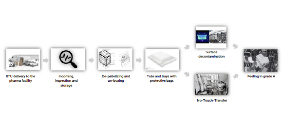The process of introducing RTU packaging into an aseptic facility involves multiple steps each of which can be executed differently depending on the chosen strategy for sterility assurance, the configuration of the production cleanroom and layout, and the potential to implement automated or semi-automated solutions. For a comprehensive analysis it is therefore necessary to break down the main steps of tubs or trays handling the process and examine each element in this chain by assessing variations and possible alternatives.