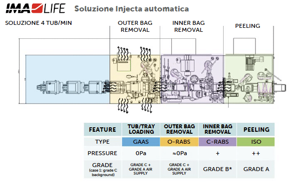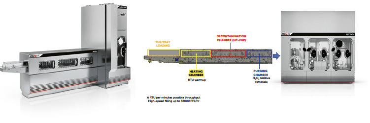 The process is divided into three chambers maintained at different pressures to achieve dynamic segregation of the VPHP within the machine and allowing for an ‘open’ process without a physical airtight separation between the decontaminated area and the external cleanroom environment. This approach enables the continuous operation of the decontamination tunnel where the RTU packaging passes through the three chambers moved by a simple roller-based conveyor system.