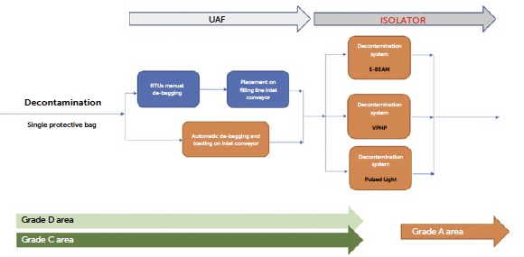 This paper illustrates cutting-edge methods for transporting the packaging system through various facility zones, from non-classified (NC) receiving areas to classified clean rooms (D, C or B grades), where the aseptic filling line begins. Here, sanitisation and bio-decontamination processes could play a vital role in reducing the bioburden on packaging prior to the fill-finish line. In aseptic isolators or RABS grade A areas, handling tubs may involve advanced decontamination systems such as E-Beam, VPHP or debagging solutions “No-Touch Transfer” (NTT), each one offering distinct advantages and challenges in sterility assurance, cost-effectiveness and operational efficiency.