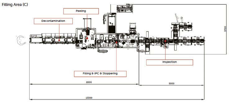 Figure 16: layout of Nebula with high-speed PFS fill-finish line. Note: in case of low-residue requirements due to sensitive products to H₂O₂ the line layout can consider an extra description chamber