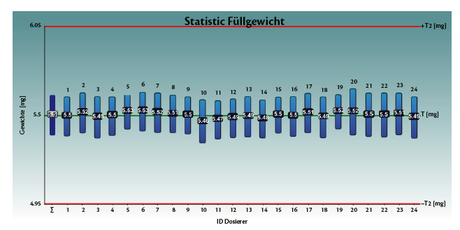 Graph 1: weighing statistics for the Total batch (T) and for each dosator individually.