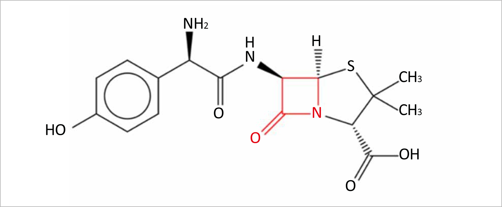 Figure 1: molecular structure of Amoxicillin together with its antibacterial properties from the existence of beta-lactam ring (in red).